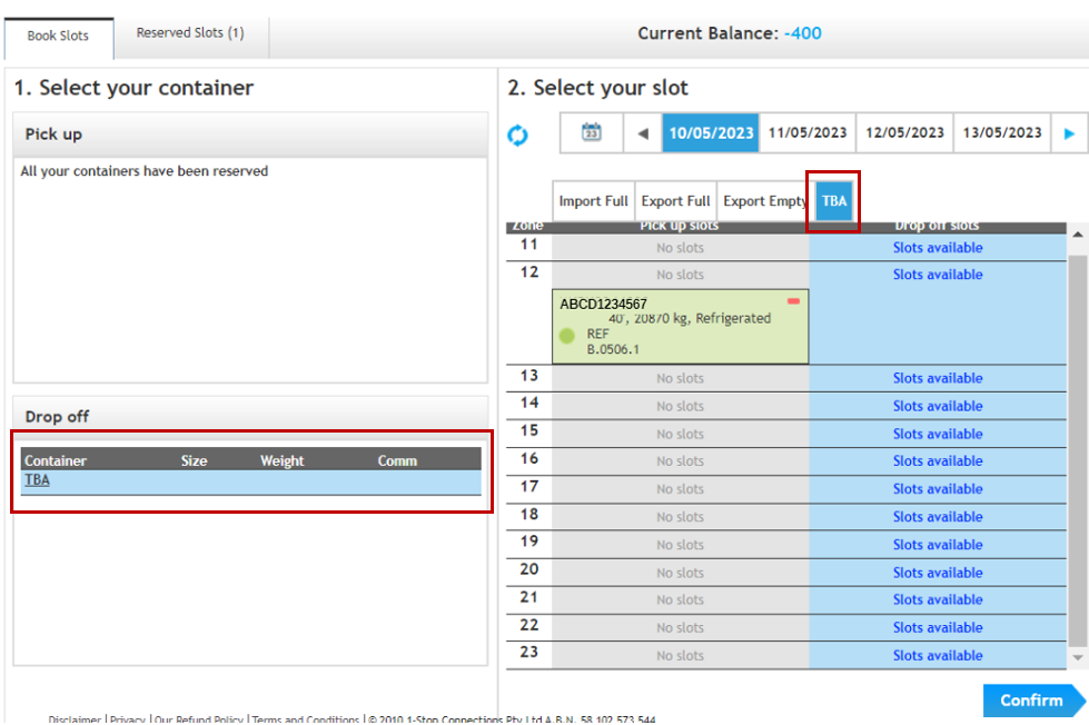 2. Click the TBA under the DROP OFF section and choose a matching zone for the PICK UP container under the TBA tab. Then, click on CONFIRM.