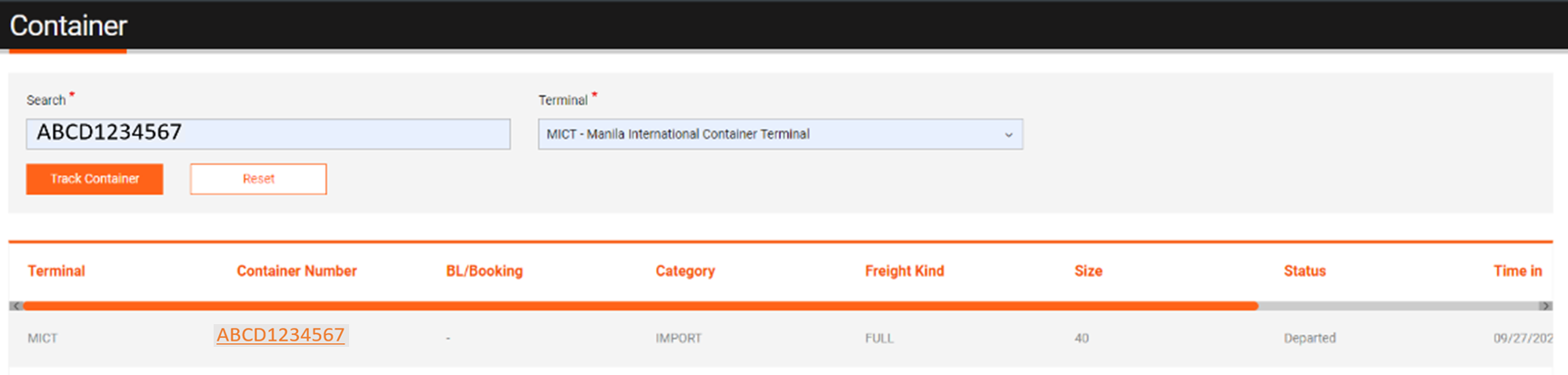 ·Input the container number or and select MICT – Manila Internal Container Terminal. Once done, click on TRACK CONTAINER then the container number.
