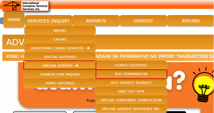 2. Hover your cursor over to SERVICES INQUIRY, click on SPECIAL SERVICES, then BOC EXAMINATION.