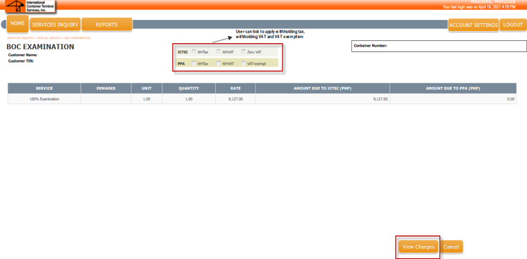 4. The charges for the container that is subject to BOC examination will be displayed. Click on VIEW CHARGES then ADD TO SUMMARY.