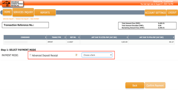 7. After successful payment, a cash sales invoice (ICTSI CSI) will automatically be generated and available for printing under Transaction Inquiry.