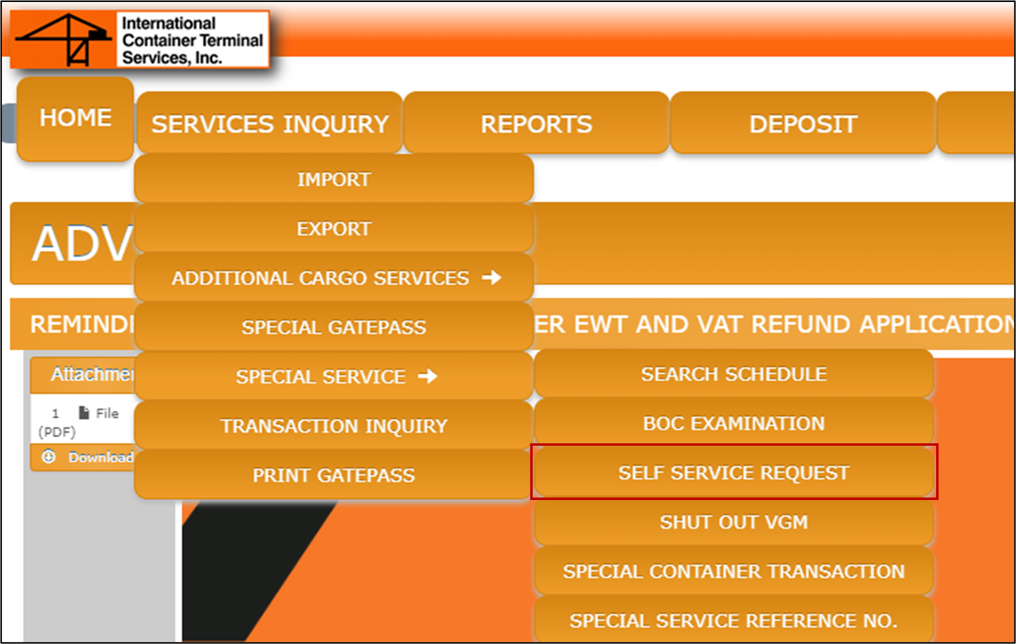 2.Hover to SERVICES INQUIRY > SPECIAL SERVICE then click on SELF SERVICE REQUEST.
