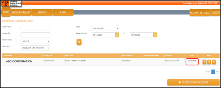 NOTE: User must tick the check box of the request to enable the PAYMENT button.