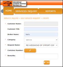 5.In the Category dropdown, choose SERVICE. Under the Request Name dropdown, choose INCOMPLETE EXPORT WEIGHING CYCLE. Click on the pencil icon to input your import container number.