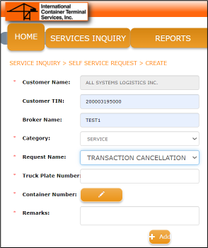 5. In the Category dropdown, choose SERVICE. Under the Request Name dropdown, choose TRANSACTION CANCELLATION/BREAKDOWN TRUCK – FOR RETURN TO YARD (OPERATIONAL). Click on the pencil icon to input your import container number.