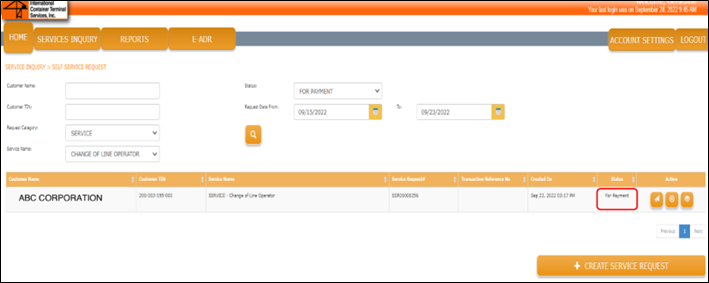 NOTE: User must tick the check box of the request to enable the PAYMENT button.