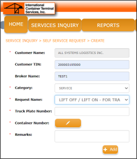 5.In the Category dropdown, choose SERVICE.Under the Request Name dropdown, choose LIFT OFF / LIFT ON – FOR TRANSFER TO RESCUE TRUCK. Click on the pencil icon to input your import container number.